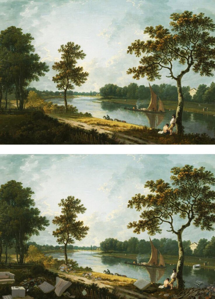 Richard Wilson’ın The Thames Near Marble Hill, Twickenham’ını alışveriş arabaları, şilteler ve çeşitli atıklar işgal ediyor.