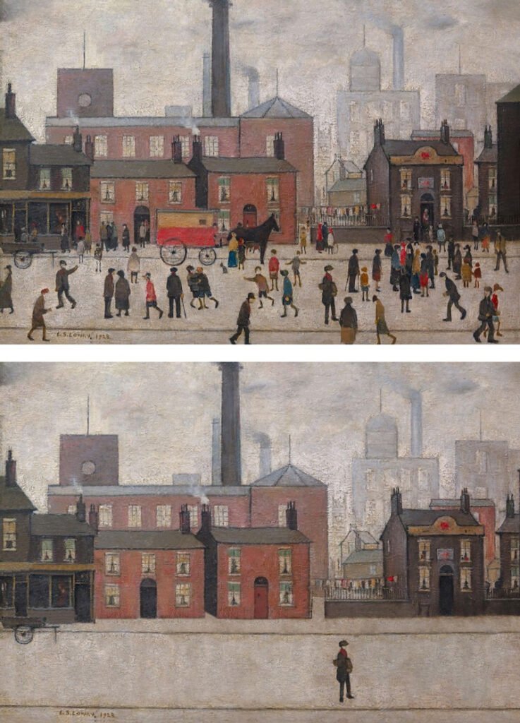 Yine aynı konuya dikkat çekmek için L.S Lowry’nin Coming Home From The Mill tablosundaki hareketli hayatı yok ederek geriye tek ve yalnız bir işçi bırakıyor.