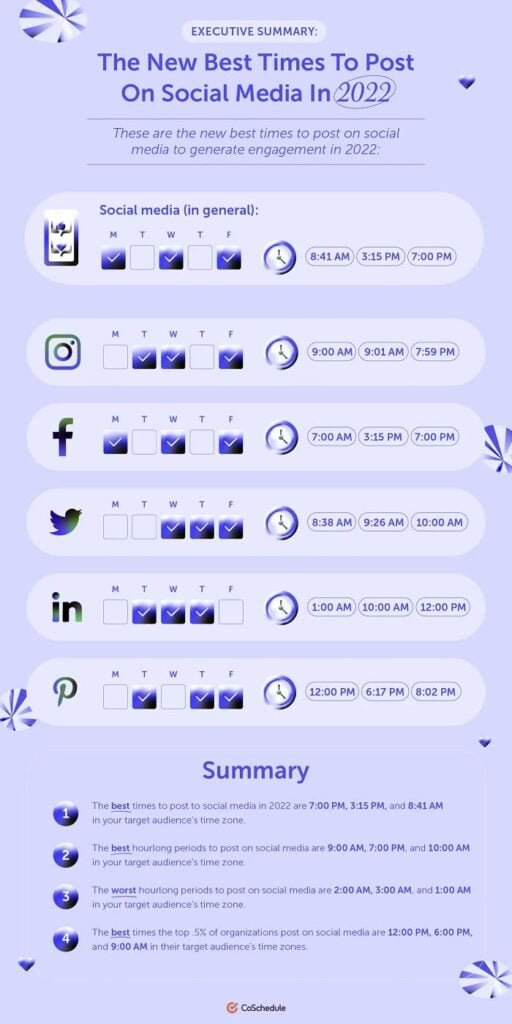 CoSchedule’ın verilerine göre, 30 bin organizasyonun 37 milyon gönderileriyle yapılan bu çalışma size genel olarak gün içinde hangi zaman diliminde gönderilerinizi yayımlamanın daha iyi olabileceğini gösteriyor.