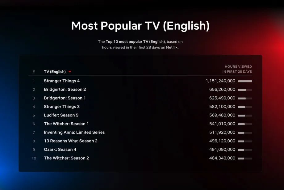 Son yayımlanan sezonuyla birlikte Stranger Things 1 milyar saat izlenme yakalayan Netflix’in ikinci dizi olmayı başardı ve bu hafta sonu 93 farklı ülkede ilk 10’a girdi. Dizinin bu başarısı diğer sezonları da etkiledi. Sezonların hepsi gene farklı ülkelerde art arda ilk 10’da. Bu başarıya ayak uyduran tek dizi ikinci sezonuyla The Umbrella Academy.
