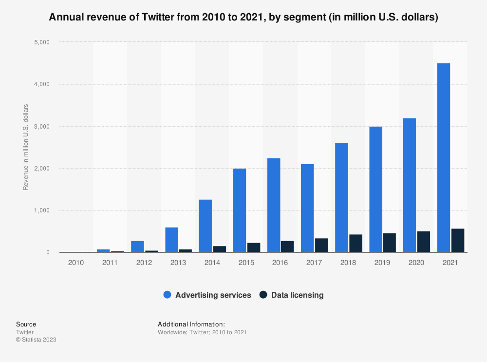 İstatistiklere bakılınca Twitter’ın en yüksek reklam gelirinin 2021’de 4,5 milyar dolar civarında, diğer yıllarda da ortalama 2,5 milyar dolar civarında olduğunu söyleyebiliriz.