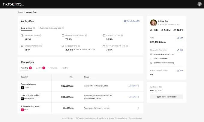 TechCrunch’ın haberine göre TikTok, Creator Marketplace’e yeni bir ‘Talent Manager’ unsuru ekliyor. Bu sayede menajerler ve temsilciler, müşterileri için marka anlaşmalarını denetleyebilecekler. Bu yeni portal aracılığıyla temsilciler, pazar yeri uygulaması aracılığıyla sunulan marka anlaşmaları da dahil olmak üzere müşterilerinin listelerinin tüm yönlerini yönetebilecekler.