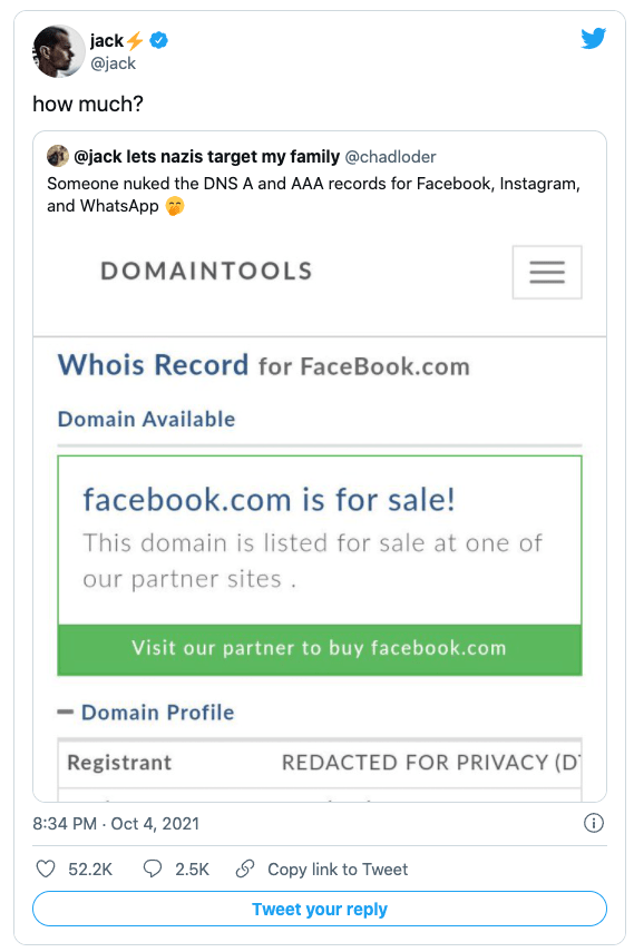 Ardından Twitter CEO’su Jack Dorsey facebook alan adının GoDaddy tarafından satışı çıkarıldığını gösteren bir ekran görüntüsünü alıntılayarak “Kaç para?” sorusunu sordu.