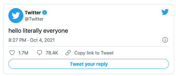 Twitter, Facebook’un durumu anlatmak için attığı tweetin ardından “Kelimenin tam anlamıyla herkese merhaba” tweetini attı.
