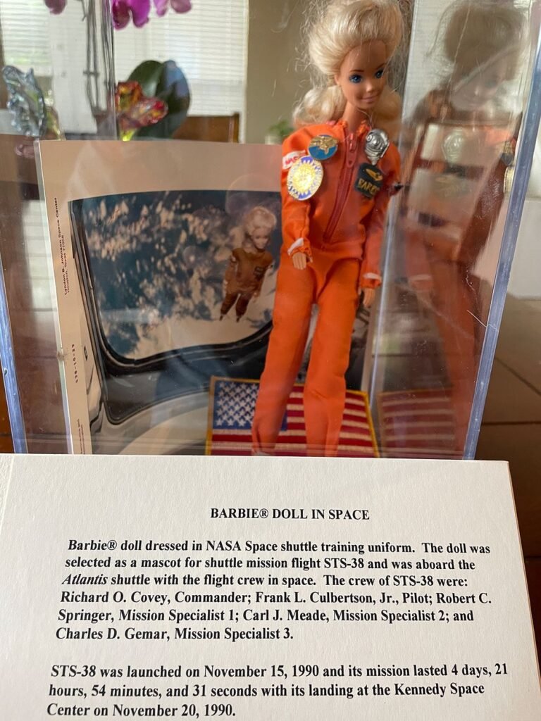Özel yapım bir uzay giysisi giymiş Barbie bebek, 15 Kasım 1990’da STS-38 görevi sırasında uzay mekiği Atlantis’te uçtu. Fotoğraflar Barbie’yi mekiğin içinde ve önünde süzülürken gösteriyor.