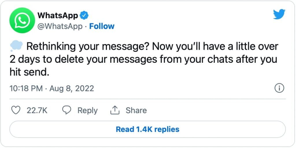 WhatsApp, artık bir mesajı iki gün artı 12 saate kadar (toplamda 60 saate kadar) silmenize izin veriyor. Böylece kullanıcılar, yanlışlıkla gönderilen bir mesajı saatler sonra bile silebilecek. Önceden bu sınır 1 saat 8 dakika ve 16 saniyeydi. Evet, şaşırtıcı gelse de ilgili saniyelerde bu süreye dahildi.