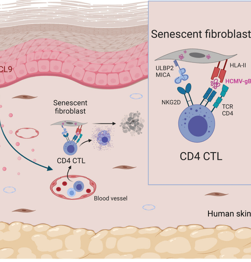 Deneyler, bir kişi yaşlandığında öldürücü CD4+ T hücreleri olarak adlandırılan belirli bağışıklık hücrelerinin yaşlanan hücrelerin artmasını engellemekten sorumlu olduğunu ileri sürdü. Doku örneklerindeki yüksek sayıda öldürücü CD4+ T hücresi, yaşlı deride azalan yaşlanmış hücre sayısı ile ilişkilendirildi.