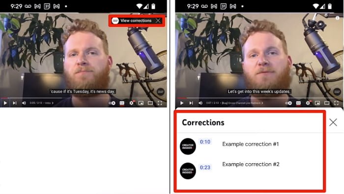Corrections (Düzeltmeler) olarak adlandırılan yeni özellik, bir klibe bir düzeltme notunun ne zaman ve nerede eklendiğini bildirmek için video oynatmada bir bilgi kartı gösterecek.