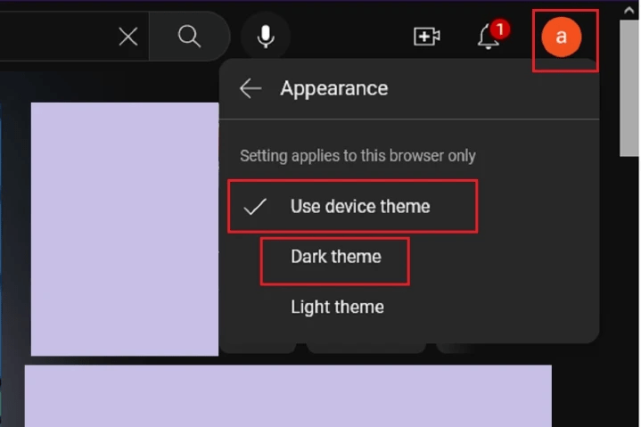 Henüz yapmadıysanız YouTube.com’a gidin ve hesabınıza giriş yapın. Ardından, Profil simgeniz> Görünüm> Koyu tema veya Cihaz temasını ayarlayın (cihazınız şu anda karanlık modda çalışıyorsa).